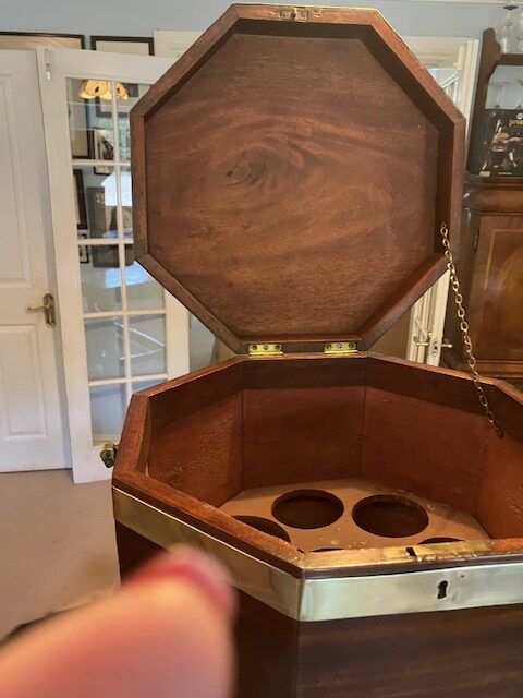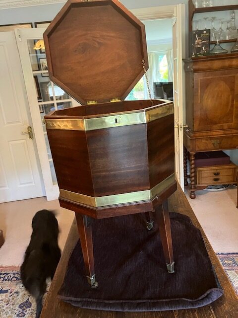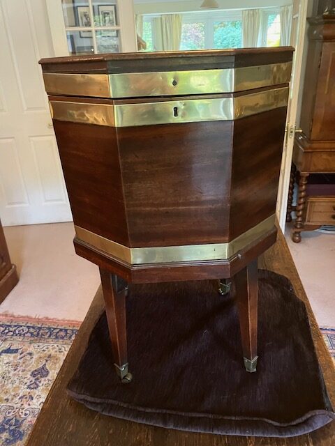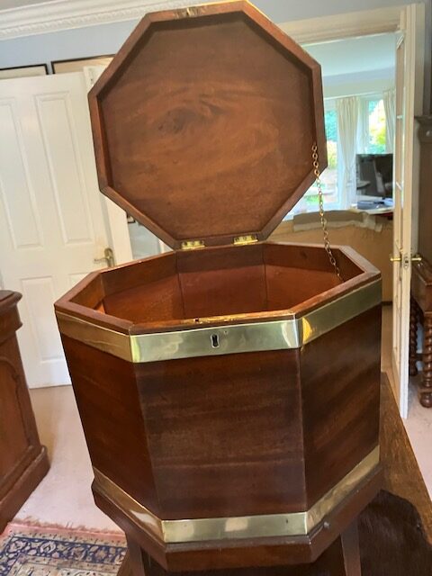 A hinged octagonal brass bound box  would originally have been lead lined to keep the bottles cool , still has the bottle holders and plug at the base to drain the melted ice. The books is on four elegant legs with grass castors at the base. A rare which is decorative but still useful.
