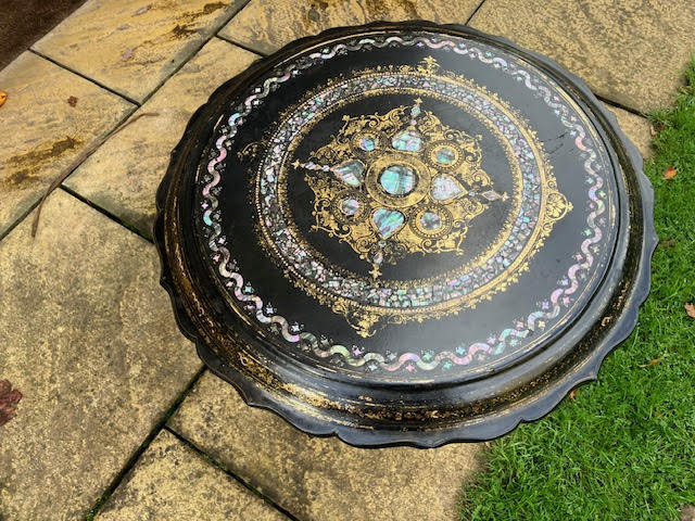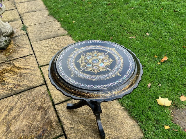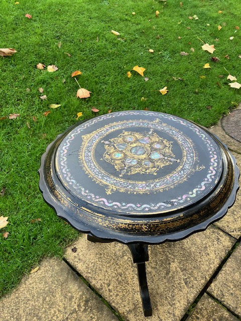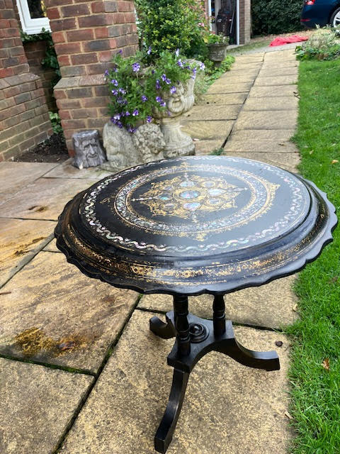 Small Ebonised table with mother of pearl inlay on tripod base.